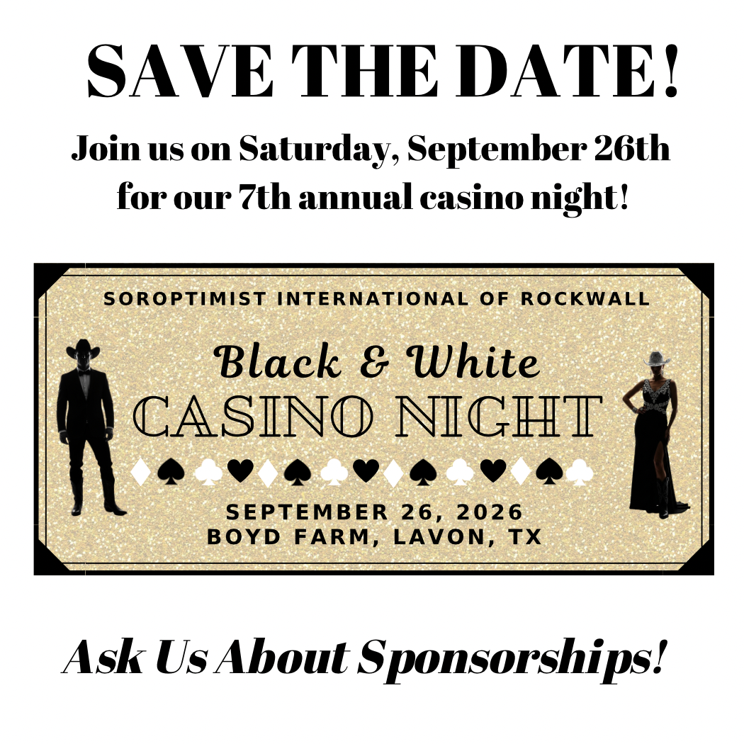 7th Annual Black & White Casino Night + Add to Google Calendar + iCal / Outlook export Date Sep 26 2026 Time 6:00 pm - 10:00 pm Location Boyd Farm 10350 St Hwy 205, Lavon, TX 75166 Share this event